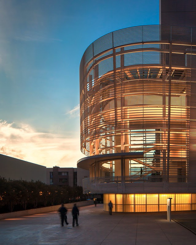 | The main entry is located in a glassed-in atrium at the end of a long ramp from Broadway, and overlooks this pedestrian plaza. Photo ©Darren Bradley |